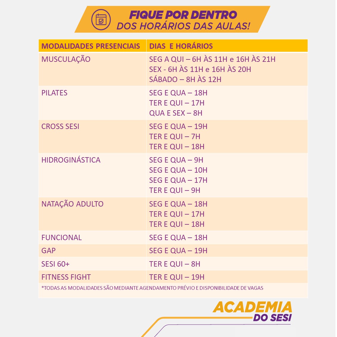 A partir do dia 1º de junho, a Academia funcionará de segunda a quinta-feira, das 6h00 às 21h00 e às sextas-feiras, das 6h00 às 20h00. As modalidades CROSS, Pilates, Hidroginástica e Natação Adulto que já estão acontecendo, continuam e outras serão retomadas como: Funcional, GAP, SESI 60+ e a novidade: Fitness Fight, aula que combina funcional e técnicas de luta. Confira dias e horários na tabela abaixo.