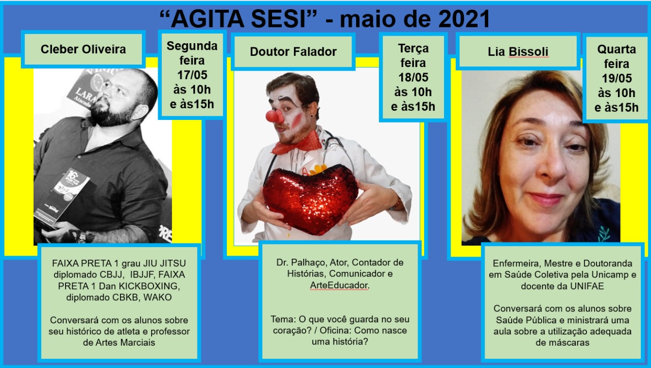 Na segunda-feira (17/05), o professor de artes marciais Cleber Oliveira conversará com os alunos sobre sua trajetória como atleta; na terça (18/05), os estudantes participarão da oficina “Como nasce uma história” com o Dr. Falador e para encerrar na quarta (19/05), o tema abordado será saúde pública com a enfermeira Lia Bissoli.