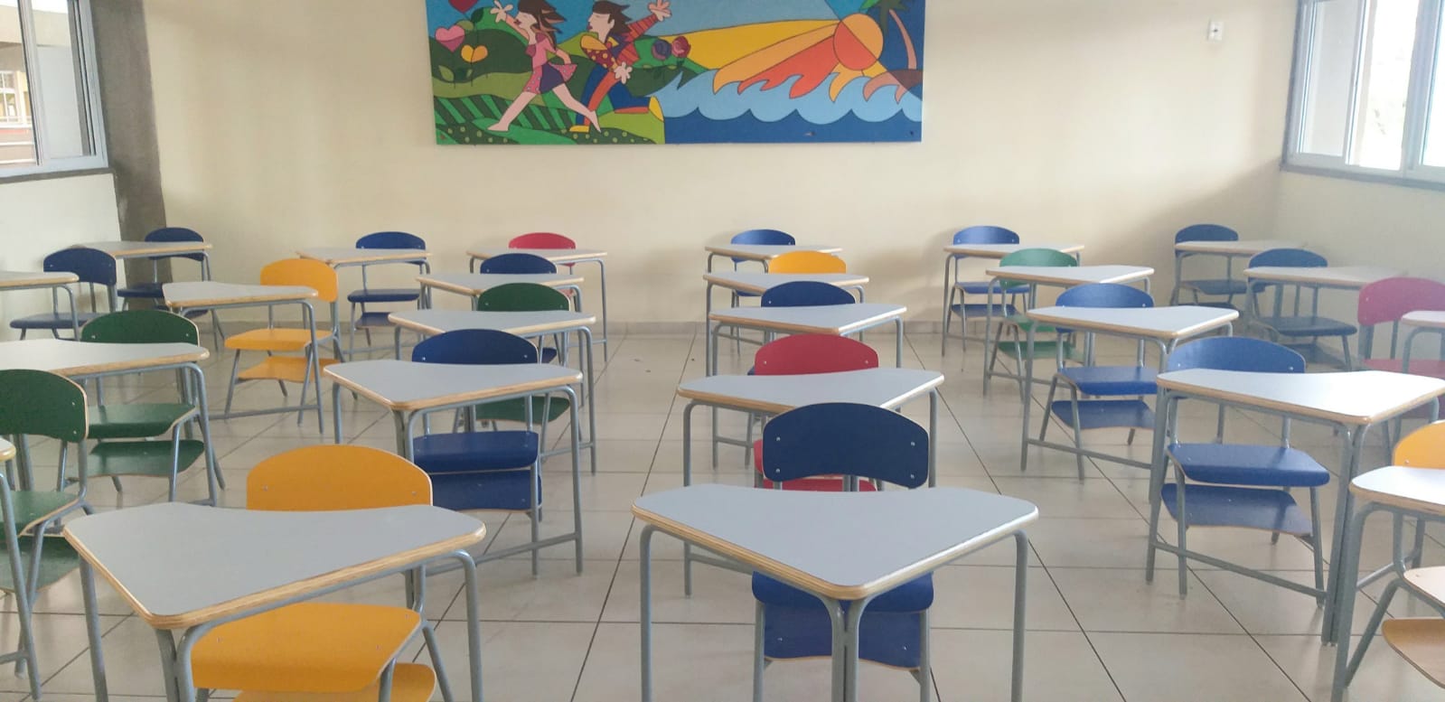 As mesas e cadeiras são coloridas, lúdicas e possibilitam o trabalho em grupo