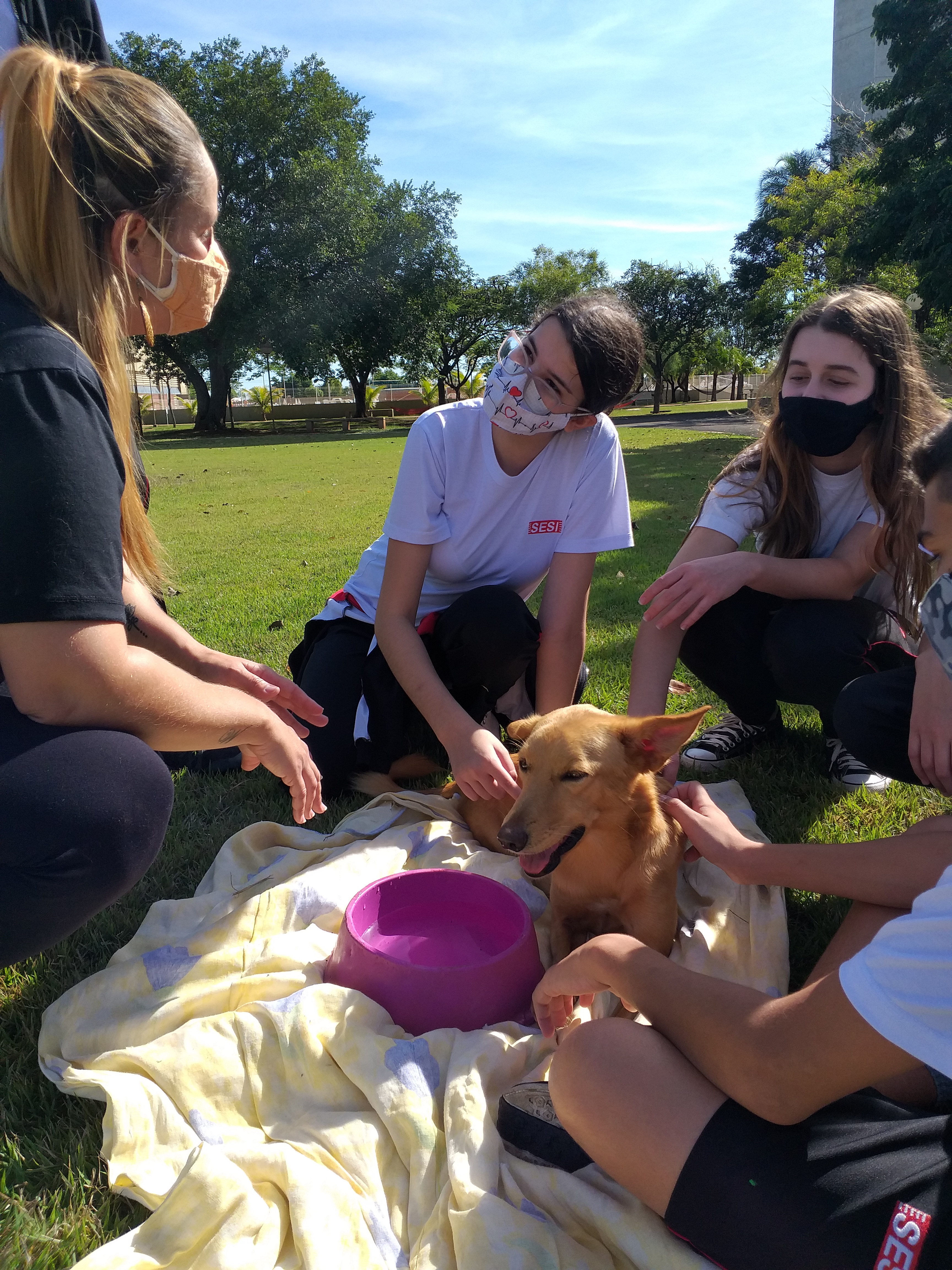Ação é parte prática de trabalho interdisciplinar. Cãezinhos resgatados estiveram na escola