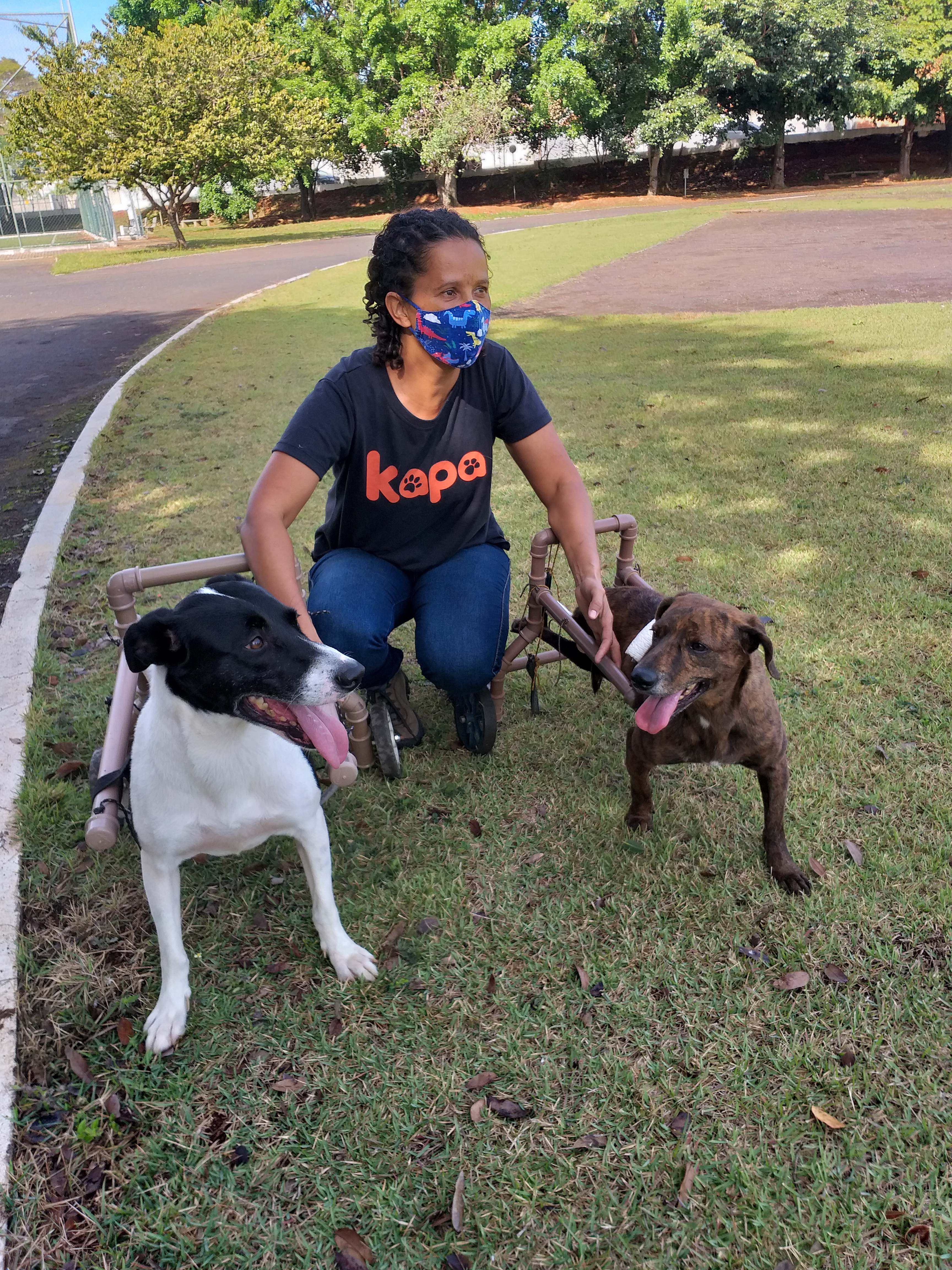 Resgatados pela Kapa, os cães João, Dênis e Laica, passaram parte da manhã brincando com os estudantes. João e Laica usam cadeira de rodas, ambos foram atropelados e abandonados. Dênis chegou à associação ainda filhote com sequelas de cinomose - doença infectocontagiosa que causada por um vírus que pode acometer cães que ainda não terminaram o esquema vacinal (filhotes) ou que não costumam receber o reforço anual da vacina múltipla (V8, V10, V11 e V12).