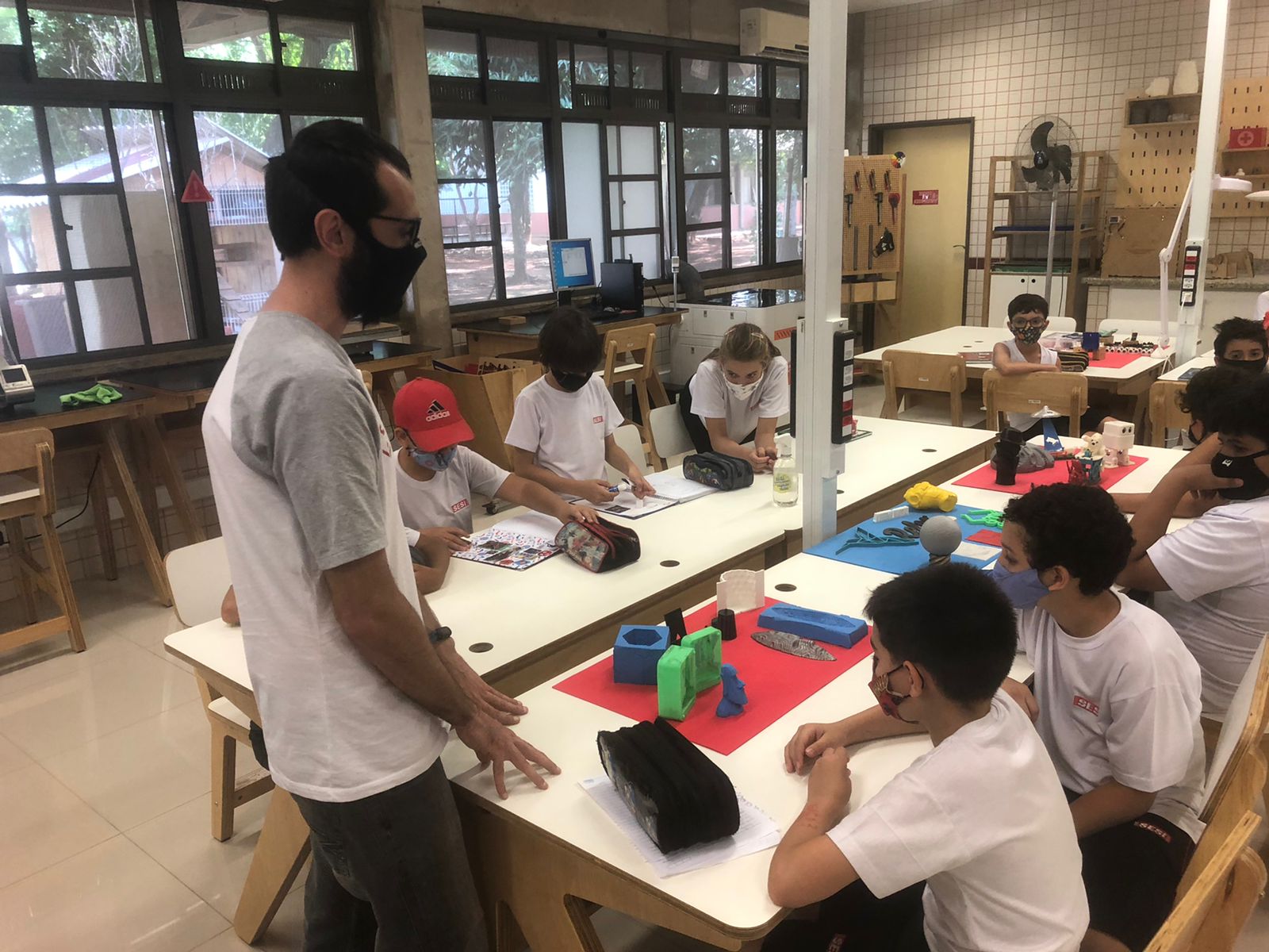 Estudantes do 4º e 5º anos B do Sesi de Mogi Guaçu estiveram no Fab Lab da escola. O técnico de laboratório didático, Theodoro Eduardo Cezar Firmino, recebeu os alunos e explicou as funcionalidades do Fab Lab, que é uma plataforma de prototipagem rápida para inovação e invenção, que estimula o aprendizado maker, a educação investigativa e o empreendedorismo – onde errar, brincar, criar, aprender, orientar e inventar são ações muito bem-vindas.
