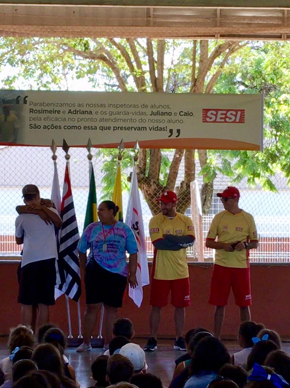 Os guarda vidas Caio Xavier de Campos e Juliano de Oliveira Nunes e as inspetoras de alunos, Rose Coutinho e Adriana Eduarda de Arruda Fernandes mostraram o porquê o trabalho integrado de equipe é importante. No dia 8 de novembro, por meio do atendimento de primeiros socorros eles salvaram a vida do aluno de 14 anos, Miguel Ribeiro.