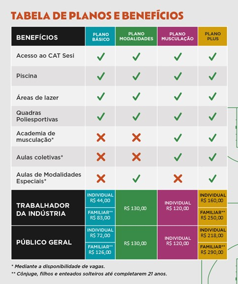 A partir do dia 02 de janeiro, todos os planos de adesão dos CATs (Centros de Atividades) do Sesi-SP passarão por reajuste. Confira os valores no CAT Sesi Mogi Guaçu, conforme tabela abaixo.