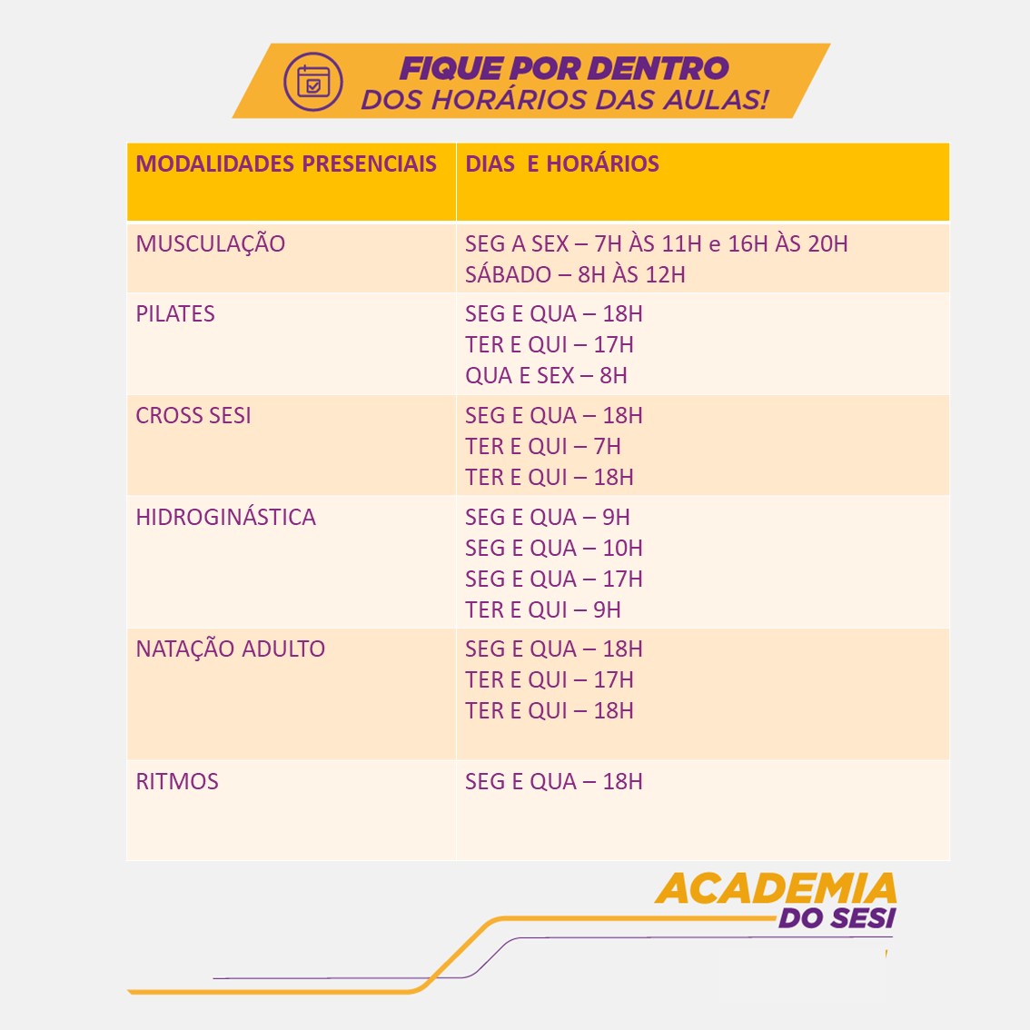 Na Musculação, serão atendidos 20 alunos por horário; já na Hidroginástica, Pilates, Cross, Natação Adulto e Ritmos, 8 alunos por horário.